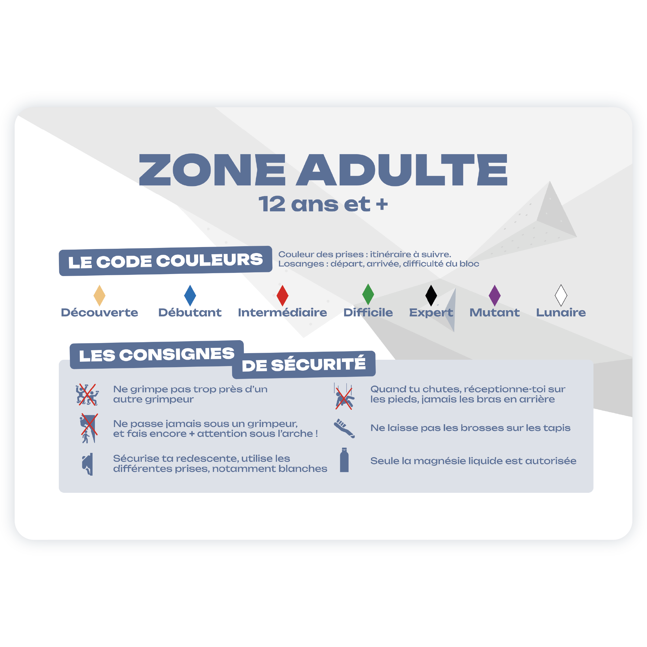 Pour démarrer, les pieds et les mains se placent sur les prises indiquées par les diamants colorés. Si vous ne trouvez pas les 4 diamants indicateurs, cela signifie que un ou plusieurs membres (pieds ou mains) n’est pas obligatoire pour réaliser le départ. Vous pouvez alors vous appuyer sur le mur ou sur les volumes gris. La prise de fin est indiquée par un diamant plus gros. On met les deux mains sur cette prise et on stabilise le mouvement. À ce moment là, vous êtes au « top », le bloc est terminé.