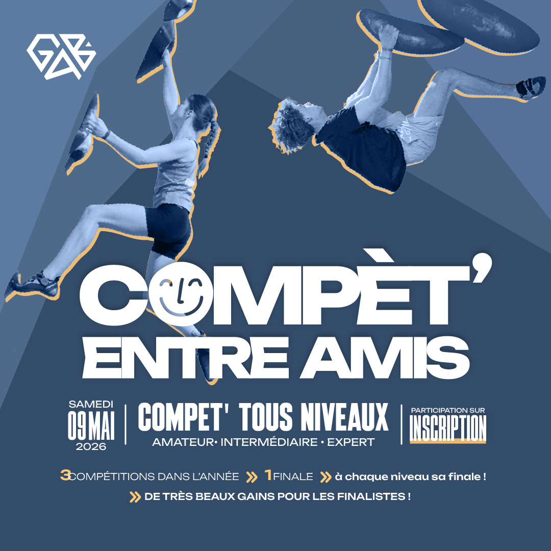 Depuis 2014, Grimp’A Bloc organise des compèt « loisir », que l’on appelle les « Compèt’ entre amis », et nous sommes ravis de vous annoncer qu’elles sont de retour pour l’année 2025/2026 !